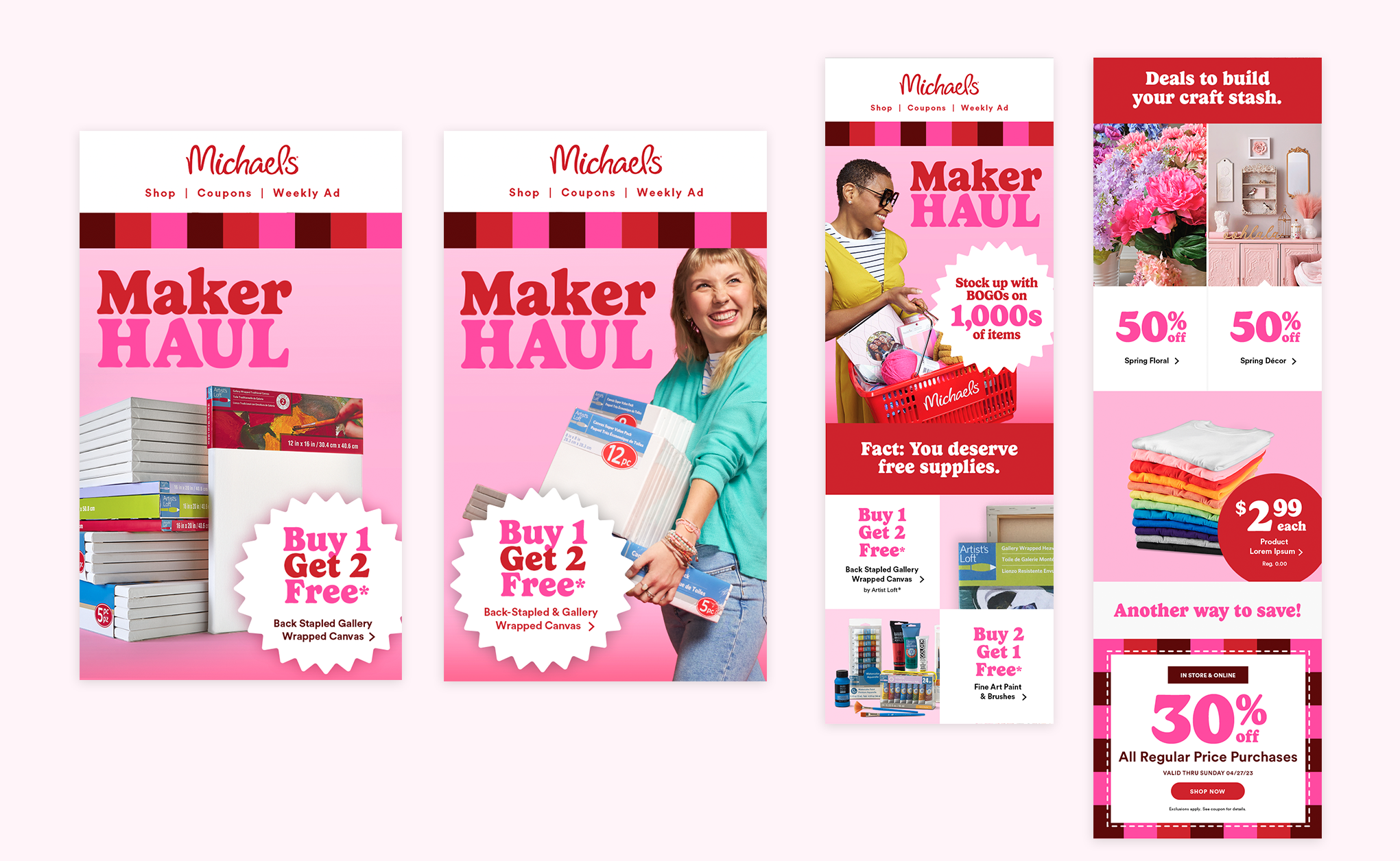 Building off an established program, and a new re-brand for Michaels, the challenge was to build a new creative language while clearly communicating complex promotional layers: BOGOs, individual promos, and loyalty incentives—across a fast-moving, multi-channel retail ecosystem.